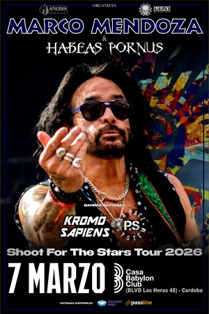 Marco Mendoza llega a Córdoba, el encuentro será este sábado 7 de marzo en Casa Babylon, desde la hora 19. La Ciudad de Córdoba será testigo del regreso de Marco Mendoza, acompañado de la banda bonaerense Habeas Pornus, comandada por Hernán García (ex O’connor), en marco de su Shoot For The Stars Tour 2026. El repertorio incluirá material de su carrera solista y clásicos de las bandas legendarias de las que ha formado parte, como Thin Lizzy, Whitesnake, Ted Nugent, entre otras. Los invitados especiales para el show del día sábado serán: Kromo Sapiens y La Paez System. Las entradas pueden adquirrse en Passline,Alpogo.com y/o mediante transferencia a Mercado Pago, donde podrás acceder a tu entrada sin Service Charge. Marco ha tocado con algunas de las bandas de rock más grandes del mundo. Pasó años formando parte de Thin Lizzy y Whitesnake, y en 2021 integró Journey, con quienes tocó en Lollapalooza ante 100.000 personas. Marco también estuvo involucrado en el proyecto paralelo de Neal Schon, Journey Through Time. Además, Marco ha tocado y realizado presentaciones icónicas en vivo alrededor del mundo con The Dead Daisies, quienes tocaron junto a una orquesta completa en Woodstock, Polonia, frente a 300.000 personas. También ha trabajado como músico de sesión en numerosos álbumes, además de haber tenido etapas en Blue Murder junto a John Sykes y en la banda de Ted Nugent. Marco ha tocado tanto como integrante de bandas como también como músico de sesión para los siguientes artistas y proyectos a lo largo de los últimos treinta años: John Sykes, Blue Murder, Ted Nugent, Thin Lizzy, Whitesnake, David Coverdale, The Dead Daisies, Dolores O’Riordan, Neal Schon, Bill Ward, Black Star Riders, Soul Sirkus, Lynch Mob, Tommy Shaw, Alias, entre muchos otros.