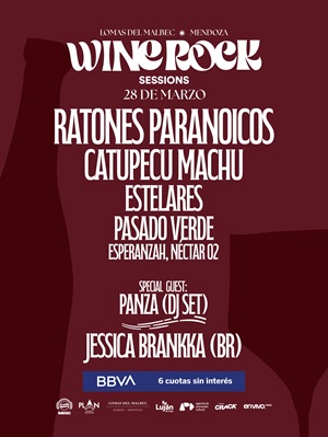 La edición 2026 confirmo su grilla que combina referentes del rock nacional , artistas mendocinos y propuestas internacionales. Además, habrá experiencias inmersivas, catas dirigidas y música en vivo al pie de la cordillera. El encuentro será el día sábado 28 de marzo en Lomas del Malbec. Dentro del line up se destacan las presencias de Ratones Paranoicos, Catupecu Machu y Estelares , entre otros. La escena mendocina será protagonista con la presentación de Pasado Verde,Esperanzah y Nectar 02, tres proyectos locales que representan el pulso actual de la música de la provincia. El Wine Rock Session 2026 tiene como exponentes a una generación que dialoga con el rock, la música latinoamericana y el pop desde nuevas estéticas y narrativas. El músico Diego Castello, conocido como Panza , baterista de Babasonicos participará en formato DJ set, aportando beats, clima festivo y un recorrido sonoro pensado para acompañar la experiencia integral del evento. Y para el cierre será el turno de la visita internacional; desde Brasil llega la Dj Jessica Brankka, con un set list vibrante y electrónico. Organizado por Produce Crack Mendoza y En Vivo Producciones, Las entradas para el sábado 28 de marzo en Lomas del Malbec están disponibles en Passline.com. Clientes Visa y Mastercard BBVA en 6 cuotas sin interés.